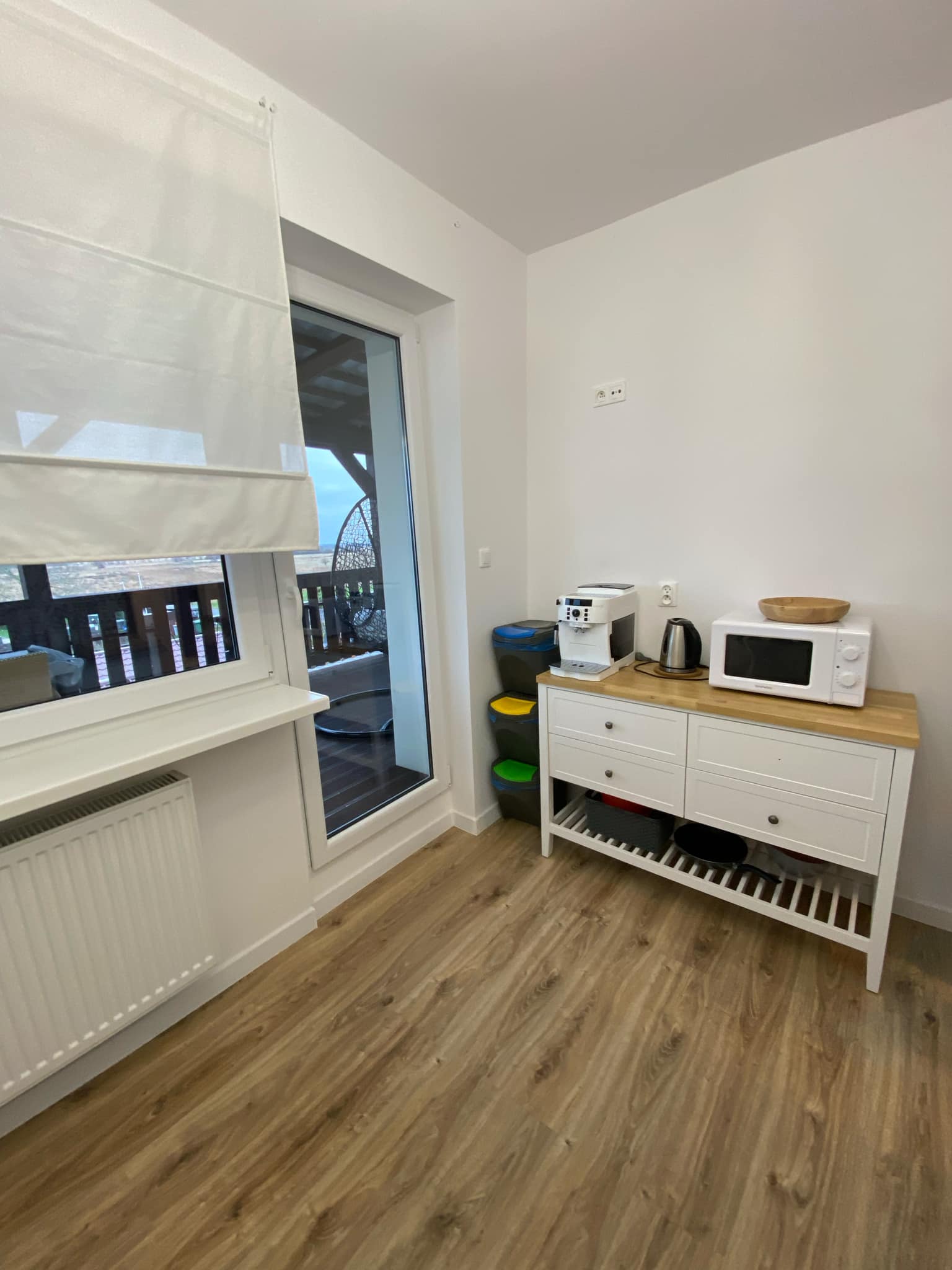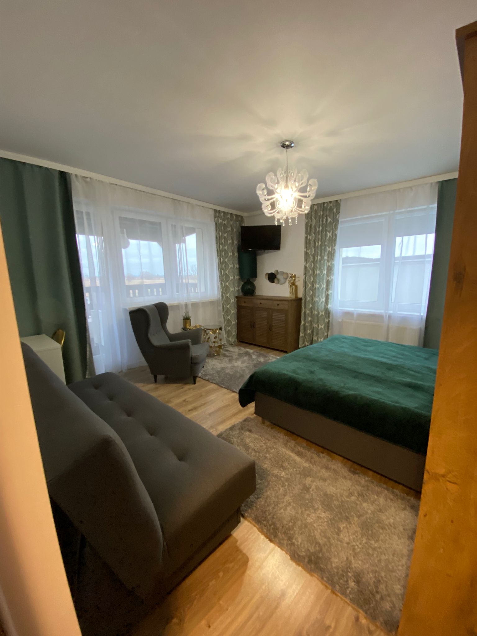 W naszej ofercie posiadamy jeden pokój rodzinny z oddzielną kuchnią i dużym tarasem wypoczynkowym. W pokoju znajduję się łóżko małżeńskie 200×200 oraz rozkładana wersalka dwuosobowa, komoda, szafa, toaletka, lampki nocne. Kuchnia przynależna do pokoju wyposażona jest w sprzęty AGD takie jak: lodówka, czajnik, ekspres do kawy, toster, mikrofalówka, płyta grzewcza na dwa stanowiska , garnki, patelnie ,sztućce, kubki, filiżanki, stół oraz blat do przygotowywania posiłków. Pokój rodzinny polecany jest rodzinom 2+2 lub 2+3 ze wstawionym łóżeczkiem turystycznym.